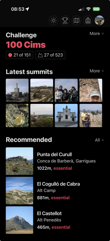 The app to track the mountains you climb. 100 Cims, other Spanish peaks, the Alps, Corsica, American summits and many more challenges in one app.